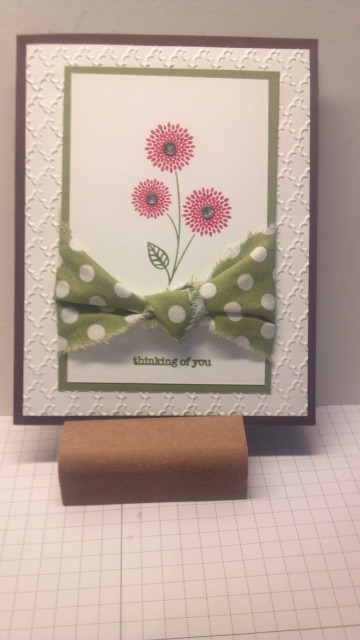 The weekend started off with a play date at my upline's house. We made 5 cards with some of the new product. Even a strip of the new fabric!!